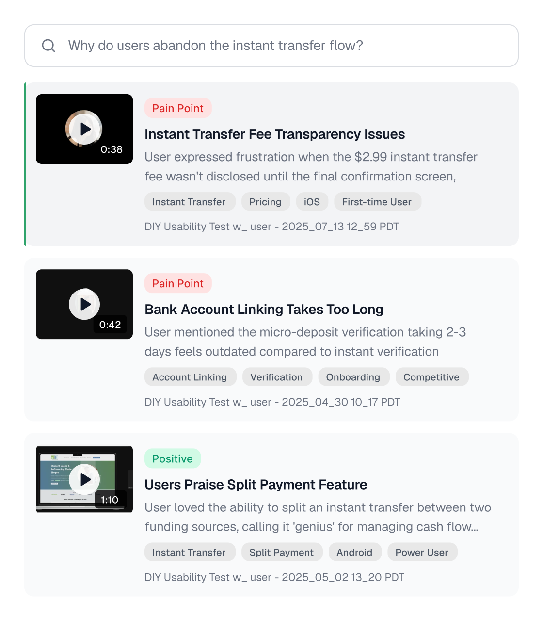 Bring insights from interviews, surveys, support tickets, and sales conversations together to see the full picture.